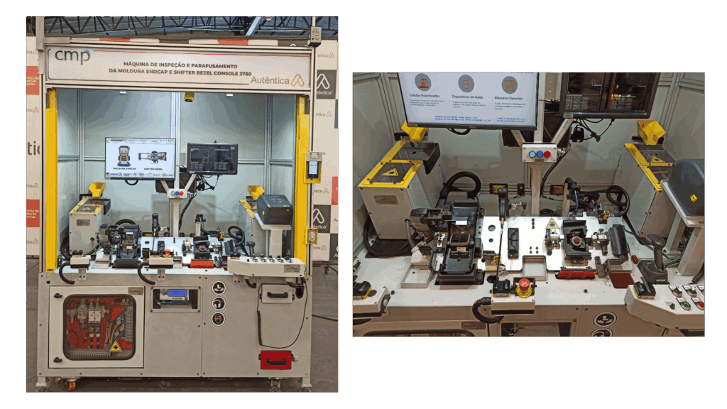 A máquina possui dois berços de trabalho independentes, um para cada produto, onde o operador realiza a montagem manual de componentes (pinos plásticos, moletas, conectores USB, difusores, parafusos etc.), enquanto o equipamento executa automaticamente as operações de parafusamento com controle de torque e ângulo, além da inspeção visual e funcional conforme o Protocolo Técnico PS 8.4 da CMP.
